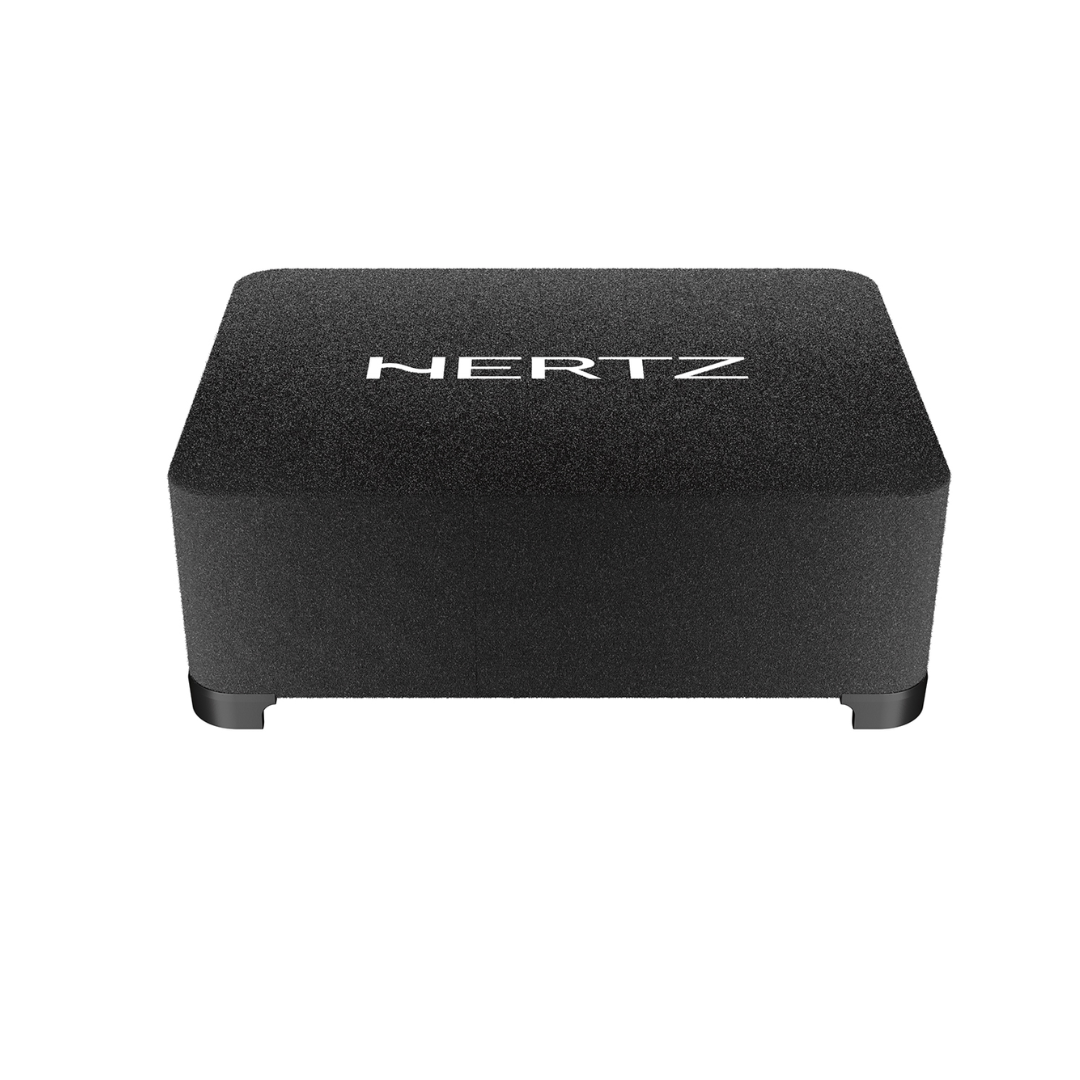 Hertz CBA 250 active subwoofer box, with the 10-inch driver, features a dedicated high-performance amplification module that enhances all the passive box technologies, such as the 2S²(2 Sides / 2 Sounds) design, the Plug & Play terminal block and ultra-compact size. The SSP (Sub Smart Plug) terminal block is provided with a single Plug & Play connector to be able to disconnect the box easily and safely. The amplification module, with power outputs of 250W RMS, is developed with he-li technology (high efficiency / low impedance), which thanks to the absence of the DC-DC voltage booster reach the impressive 90% efficiency level, very close to the theoretical limit of the D-Class. The Butterworth low pass filter at 12dB/Oct. with variable cut-off frequency (50-200 Hz) can be bypassed, when used with an external processor with pre-out output dedicated to the sub. The adjustable bass-boost control (0 ÷ 6 dB) at 45 Hz allows the user to emphasize the response on the lower side of the spectrum and the Phase control (0 – 180°) completes the equipment. The high-level speaker-in input on the multi-pole connector eases the integration with OEM audio systems while the low-level input on RCA is dedicated to the connection with after-market sources.